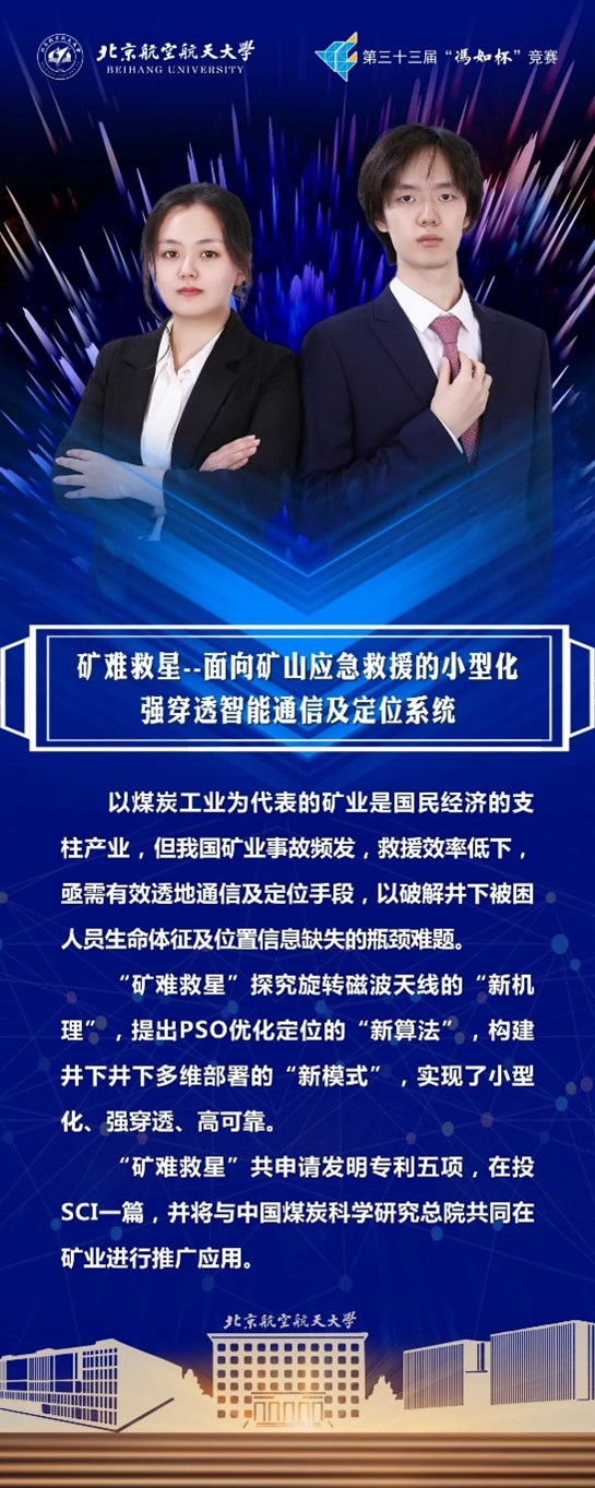 项目简介:以煤炭工业为代表的矿业是国民经济的支柱产业,但我国矿业事故频发,救援效率低下,亟需有效透地通信及定位手段,以破解井下被困人员生命体征及位置信息缺失的瓶颈难题。"矿难救星"探究旋转磁波天线的"新机理",提出PSO优化定位的"新算法",构建井下多维部署的"新模式",实现了小型化、强穿透、高可靠。"矿难救星"共申请发明专利3项,获33届冯如杯主赛道制作组一等奖,与煤炭科学研究总院达成合作意向。