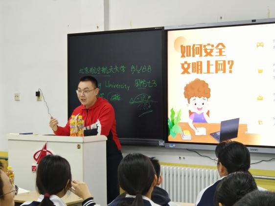 黑板与大屏幕上,勾勒出了北航学术环境的剪影;学生们手中翻阅的传单上,描绘出了北航校园生活的愉悦。我们在这次宣讲中有着充足的人手、资源与准备时间,因此活动开展的非常顺利。北航的大类招生政策,7个书院,沈元学院小班制,顶尖工科,一流理科,精品文科,都在吸引着想要进步的同学们的目光;三校区制,广袤的学校面积,新北宿舍剪影,社团活动,科研经费,也都展现出了北航的资金充足,实力雄厚;自习室一角,图书馆照片,灯火通明的新主楼,风扇轰鸣的实验室,也在诉说着北航浓厚的学术氛围。几页ppt翻下来,许多同学已经被勾起了对北航非常浓厚的兴趣。课间休息,无数同学举手发问,踊跃地表达自己对于未来的规划与畅想……