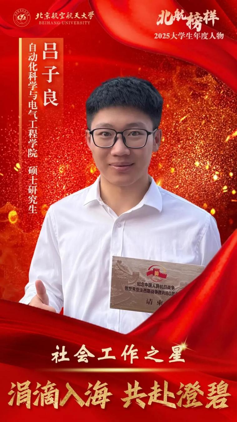 从西部讲台到学联舞台,从班级服务到国家庆典保障,吕子良以“涓滴入海”的奉献精神,在社会工作中践行青年使命。他的经历与成绩,生动诠释了北航青年的抱负与担当,成为广大学子学习的榜样。